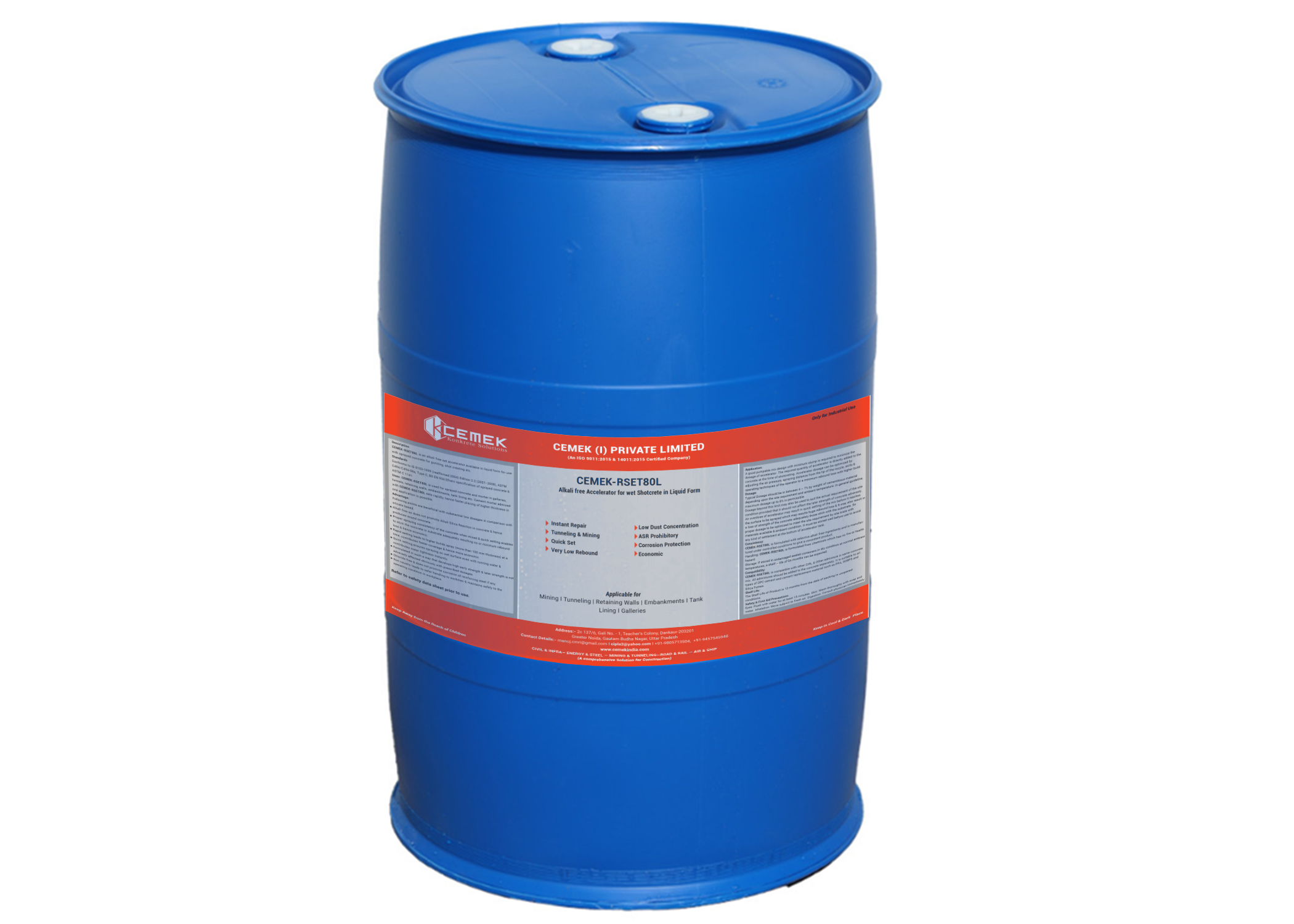 CEMEK-RSET80L is an alkali free set accelerator available in liquid form for use with sprayed concrete for guniting, shot creating etc.